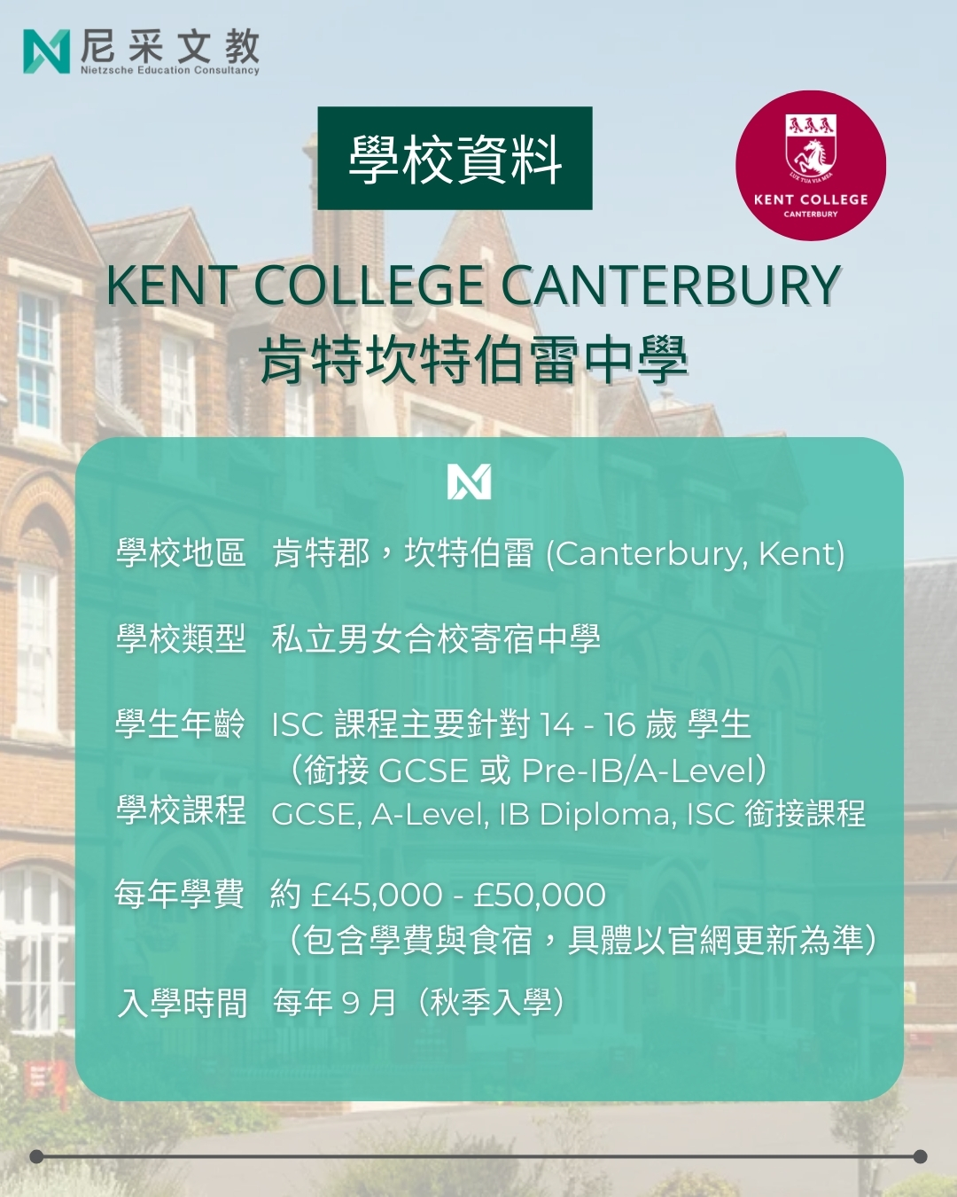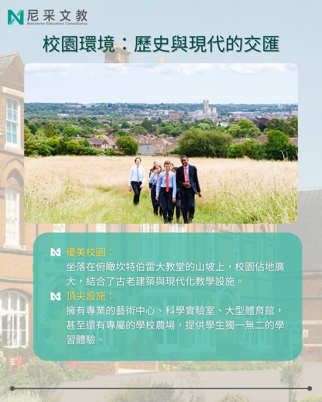 🏰 獨一無二的學習環境:校園坐落於俯瞰坎特伯雷大教堂的山坡上,擁有專業藝術中心、甚至還有專屬學校農場提供獨特體驗。